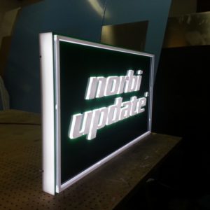 A látványosabb kivitel intarziázott előlappal készül, mely lehet akár 3D betűkkel kombinálva is. Előlapként gyakran alkalmazzuk a korszerű szendvicslemezeket ( DIBOND ) lemezt is. Ennél a megoldásnál csak a cég logo vagy cég felírat világít, így este olyan hatást kelt mintha 3D betűkből lenne kirakva a felírat.